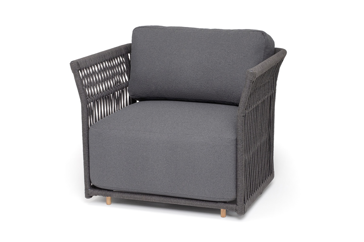 Кресло имеет алюминиевый каркас, окрашенный порошковой краской в темно-серый (RAL7024) цвет. Боковины каркаса и спинка вручную оплетены роупом - эластичными синтетическими лентами, изготовленными из высокопрочных полиэфирных волокон. Цвет оплетки в тон каркасу - темно-серый. На ножках кресла идут дубовые наконечники (заглушки).