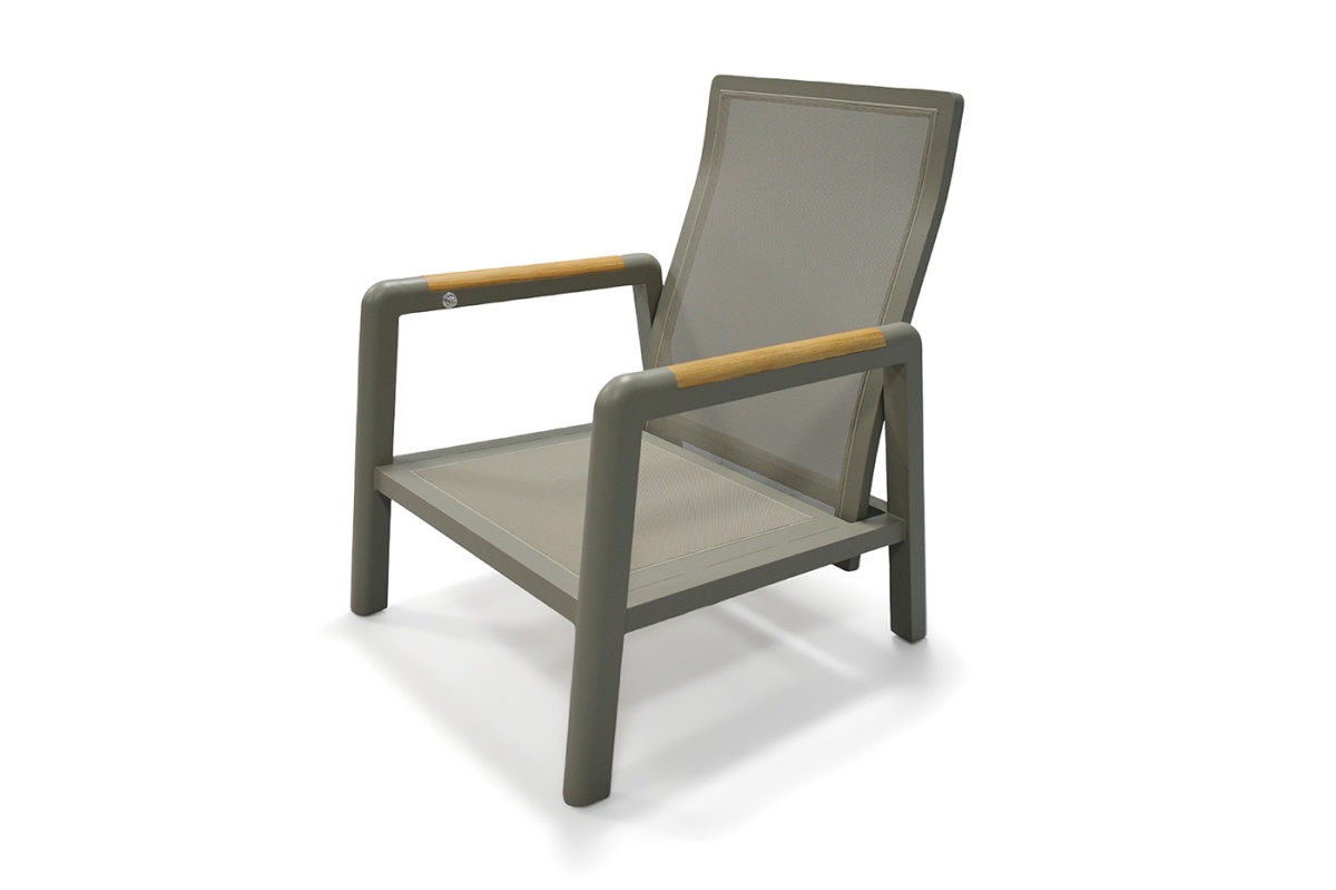Каркас выполнен из прочного алюминия, обработанного порошковым покрытием светло-серого цвета, что обеспечивает устойчивость к коррозии и долговечность в эксплуатации. Подлокотники украшены вставками из тикового дерева.