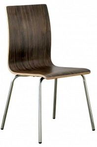 Стул металлический. Каркас - нержавеющая сталь полированная до зеркального вида. Спинка и сиденье - жесткое. Сиденье - ламинированная фанера. Цвет: темный орех.