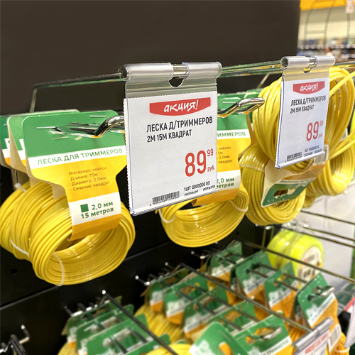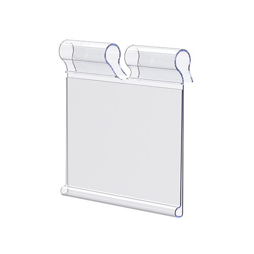 Ценникодержатель откидной на T-образные металлические крючки. Допустимая толщина прутка, на которую вешается ценникодержатель 4 - 7 мм.