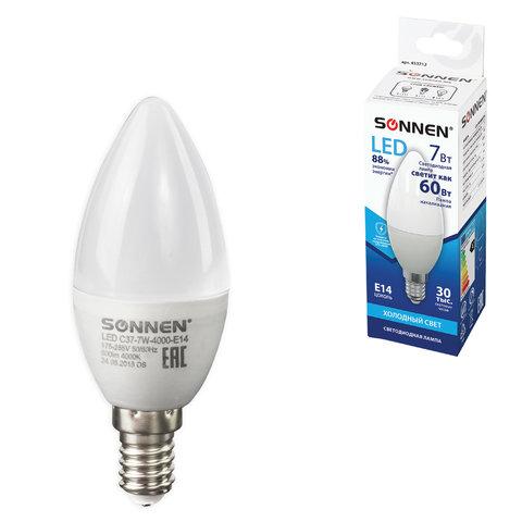 Лампа светодиодная SONNEN, 7 (60) Вт, цоколь Е14, свеча, нейтральный белый свет, 30000 ч, LED C37-7W-4000-E14, 453712