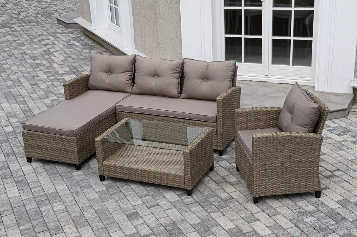 Плетеная мебель дополнена удобными подушками в бежевых чехлах. При их изготовлении используют полиэстер, плотность – 230гр/м2.