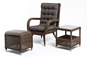 Кресло и пуф укомплектованы подушками со съёмными чехлами из влагостойкого 100%-го полиэстера.