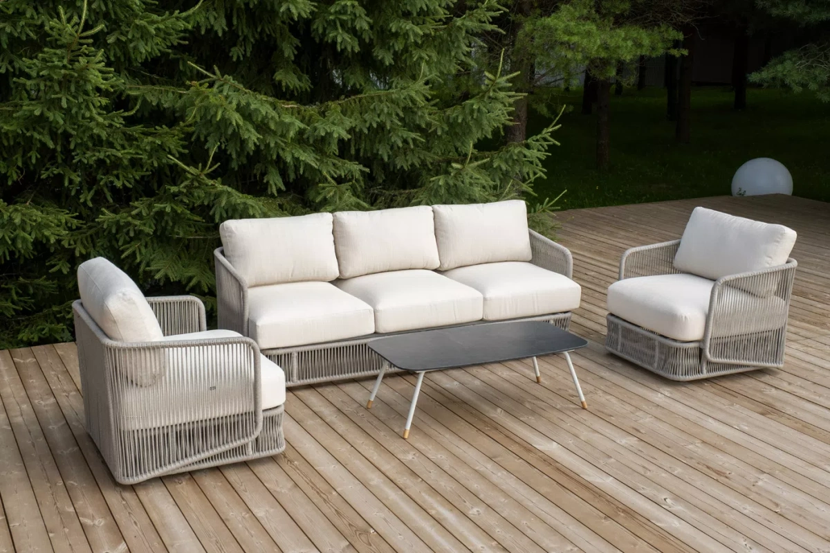 Каркас уличной мебели выполнен из износостойкого алюминия. Его дополняет бежевая ручная оплетка, изготовленная на основе эластичных синтетических лент из полиэфирных волокон высокой прочности (роупа).