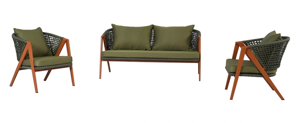 Диван и кресла изготовлены из алюминиевого каркаса, оплетенного вручную эластичными синтетическими лентами из высокопрочных полиэфирных волокон. Роуп является гипоаллергенным, прочным, износостойким и устойчивым к ультрафиолету. Цвет каркаса – «под дерево», оплетки - зеленый. На ножках стула идут черные пластиковые наконечники (заглушки).