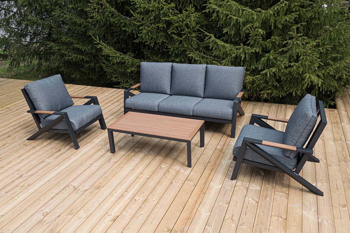 Каркас мебели выполнен из прочного алюминия темно-серого цвета. На подлокотниках дивана и двух кресел установлен облицовочный материал из древесно полимерного композита (ДПК) цвет «дерево». Крепление к каркасу осуществляется на болтах с пластиковыми заглушками темно-серого цвета, которые не ржавеют. Комплект дополняют подушки со съёмными чехлами. Материал чехлов - 100% полиэстер плотностью 190гр/м2.