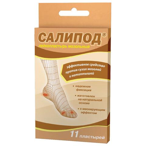 Салициловый лейкопластырь для лечения сухих мозолей и натоптышей, в современной упаковке в виде набора: 11 пластырей 3 размеров.Пластыри, входящие в состав набора, обладают следующими характеристиками: - обеспечивают кератолитический эффект; - обеспечивают возможность выбрать подходящий пластырь для мозолей и натоптышей на различных участках стопы, для самостоятельного моделирования формы; - размягчают даже «застарелые» сухие мозоли и натоптыши; - обеспечивают маскирующий эффект; - разнообразие размеров: пластыри 0,95 х 3,8 с салициловым тампоном – 5 шт., круглый салициловый пластырь диаметром 2,3 см – 3 шт., фиксирующий пластырь 3,8 х 3,8 – 3 шт. Основными действующими веществами пластыря являются салициловая кислота, которая размягчает ткани натоптышей, а также сера обеспечивающая противомикробное и кератолитическое действия на кожные покровы, причем салициловая кислоты улучшает проникновение серы в глубоколежащие слои кожи, что способствует угнетению бактериальной либо грибковой инфекции, сопровождающей в некоторых случаях образование натоптышей. Специфический запах пластыря обусловлен компонентами пластырной массы (сера, канифоль, ланолин, каучук и пр.) и является нормой для мозольных пластырей.