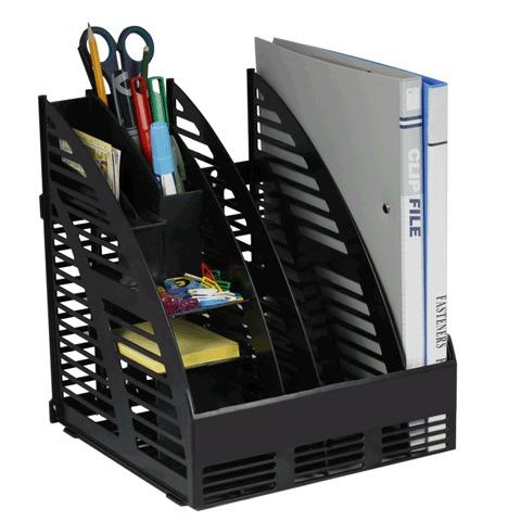 Уникальная конструкция лотка позволяет наиболее рационально использовать рабочее место. Совмещает классический 3-секционный вертикальный лоток для бумаг А4 и универсальный органайзер для письменных принадлежностей и канцелярских мелочей.