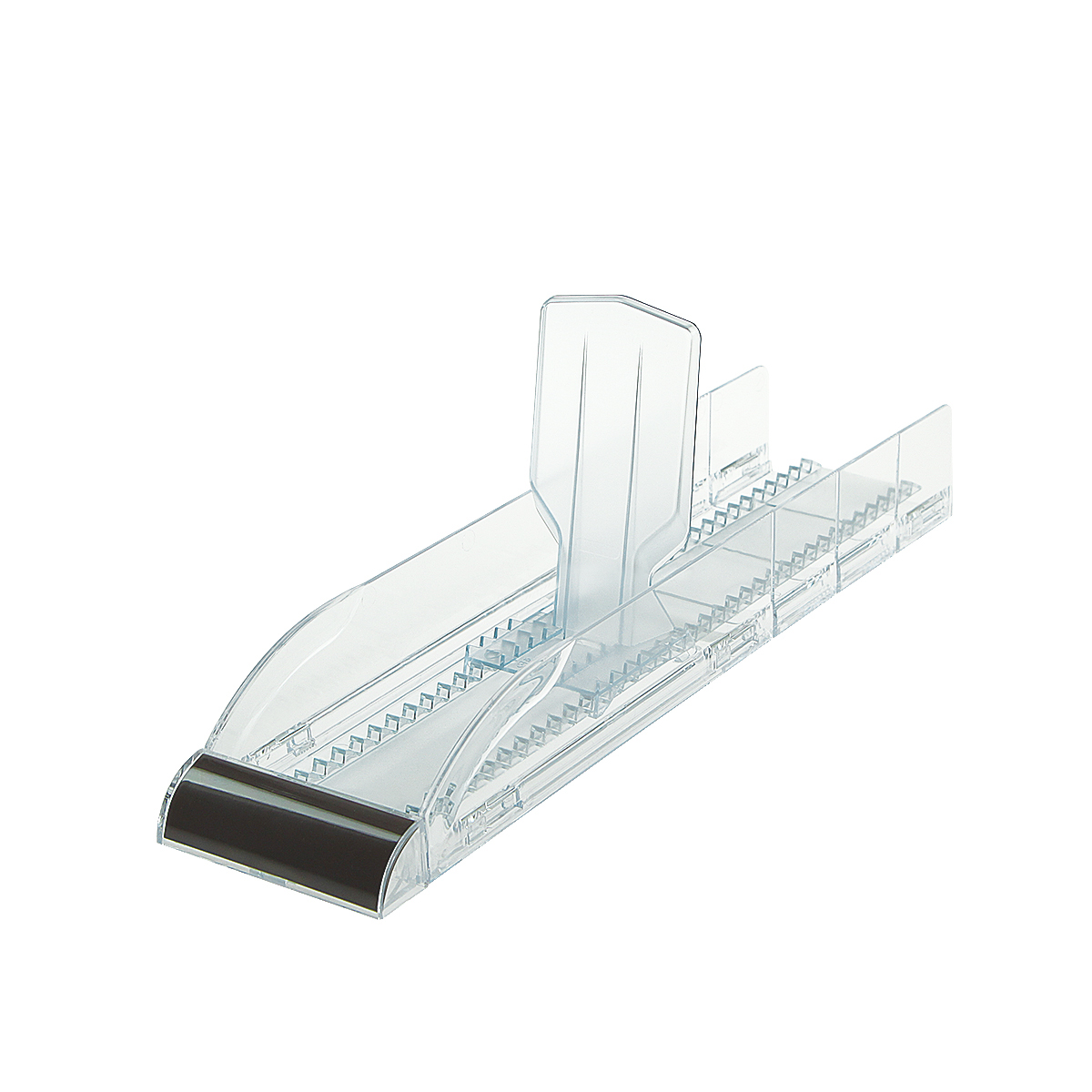Лоток для выкладки плиточного шоколада позволяет компактно разместить шоколад на полке, удерживая его на узкой торцевой стороне шоколадных плиток. Задняя опора, которой укомплектован лоток, позволяет удерживать плитки шоколада «лицом» к покупателю. Лоток походит для полок глубиной не менее 350 мм.