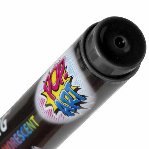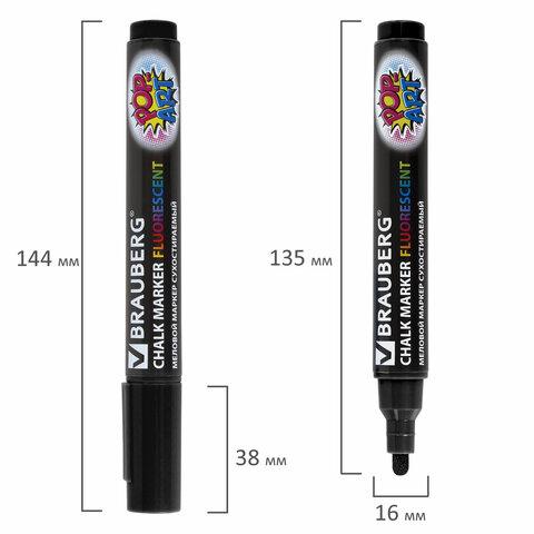 Стираемый меловой маркер BRAUBERG "POP-ART" - оригинальный инструмент для оформления различных зон помещений. Идеален для использования на школьных занятиях и детского творчества.СПОСОБ ПРИМЕНЕНИЯ: 1. Перед использованием хорошо встряхнуть с закрытым колпачком. 2. Снять колпачок, надавить на наконечник, дождаться, когда чернила полностью пропитают его. 3. После использования плотно закрыть колпачок. Предназначен для росписи, создания рисунков и надписей на зеркалах, стекле, меловой пленке и прочих гладких и прозрачных невпитывающих поверхностях. Рисунок получается плотный и яркий. Чернила на водно-меловой основе черного цвета без резкого запаха. Толщина линии письма - от 1 мм до 5 мм, зависит от угла наклона мелового маркера. Круглый корпус выполнен из пластика. Обладает следующими преимуществами: - чернила светятся в УФ-свете; - повышенная светостойкость; - пулевидный наконечник устойчив к повреждению и истиранию.