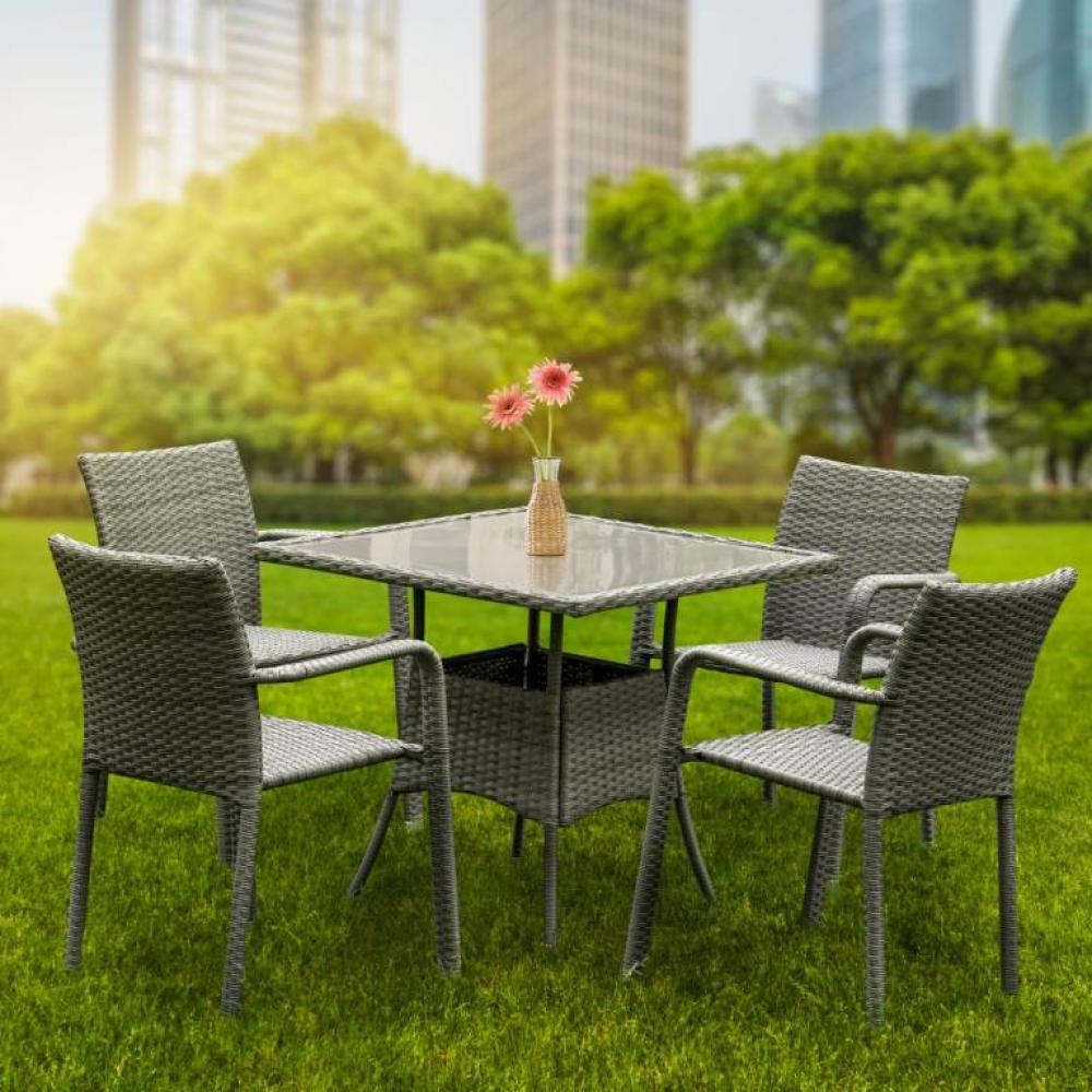 В составе комплекта: стол и 4 стула. Первоклассная лоза из искусственного ротанга серого цвета стойкая к любым погодным проявлениям. Крепкий каркас из оцинкованной стали и отличным качеством сварки. Изделие сплетено вручную нашими мастерами под жестким контролем качества на каждом этапе производства. Лоза максимально приближена по рельефу и текстуре к естественному материалу. Подходит для использования на улице и внутри помещения в любую погоду. Не боится влаги, прямых солнечных лучей и холода.