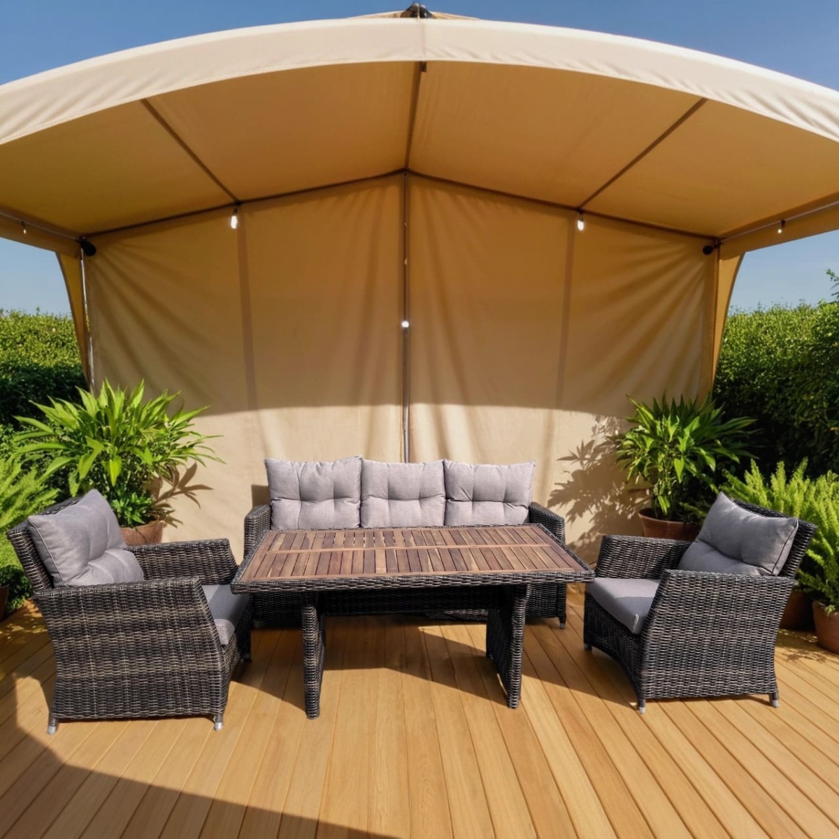 В составе комплекта: Трехместный диван, стол (столешница дерево) и 2 кресла. Высококачественная лоза из полиротанга коричневого цвета стойкая к любым атмосферным явлениям. Крепкий стальной каркас с полимерным антивандальным покрытием и отличным качеством сварки. Изделие сплетено вручную нашими мастерами под жестким контролем качества на каждом этапе производства. Лоза максимально приближена по рельефу и текстуре к естественному материалу. Идеально подходит для использования на улице и внутри помещения в любую погоду. Не боится воды, солнца и минусовой температуры.