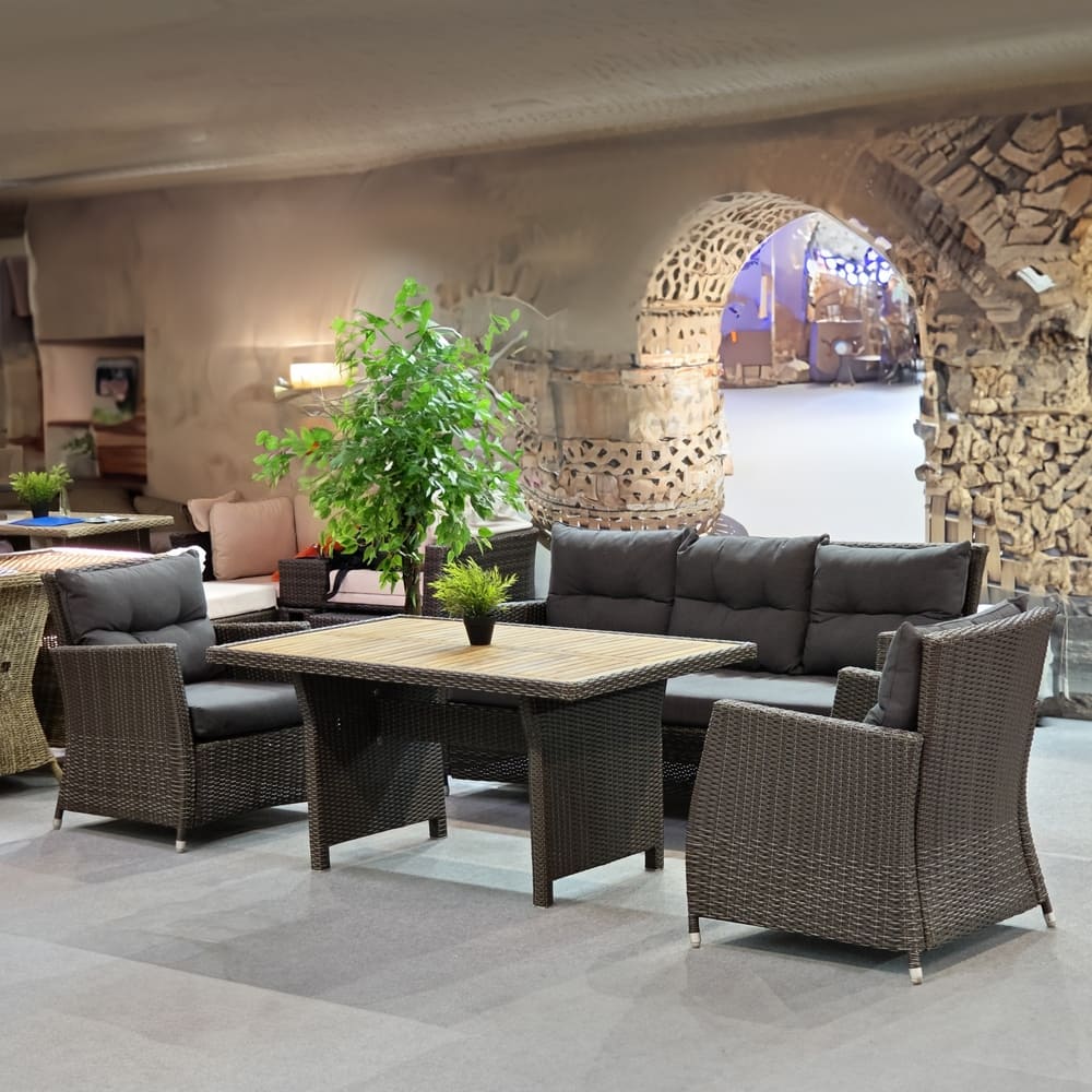 В составе комплекта: Трехместный диван, стол (столешница дерево) и 2 кресла. Высококачественная лоза из полиротанга коричневого цвета стойкая к любым атмосферным явлениям. Крепкий стальной каркас с полимерным антивандальным покрытием и отличным качеством сварки. Изделие сплетено вручную нашими мастерами под жестким контролем качества на каждом этапе производства. Лоза максимально приближена по рельефу и текстуре к естественному материалу. Идеально подходит для использования на улице и внутри помещения в любую погоду. Не боится воды, солнца и минусовой температуры.