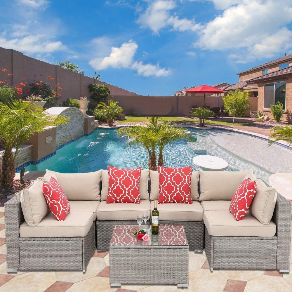 Стекло: закаленное-5мм. Каркас: сталь. Материал: искусственный ротанг серого цвета. Подушки для сидения (10см. ) в комплекте бежевого цвета. Оттенки на фото и дизайн подушек могут отличаться от образца. Декоративных подушек в комплекте не предусмотрено!