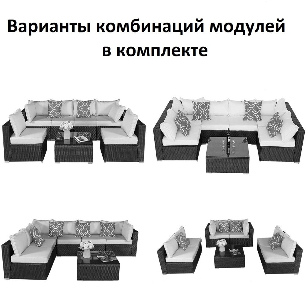 Комплект мебели состоит из: Угол (2 шт.): W75xD75xH65 см. Середина (4 шт.): W65xD75xH65 см. Стол: L65xW65xH32 см.