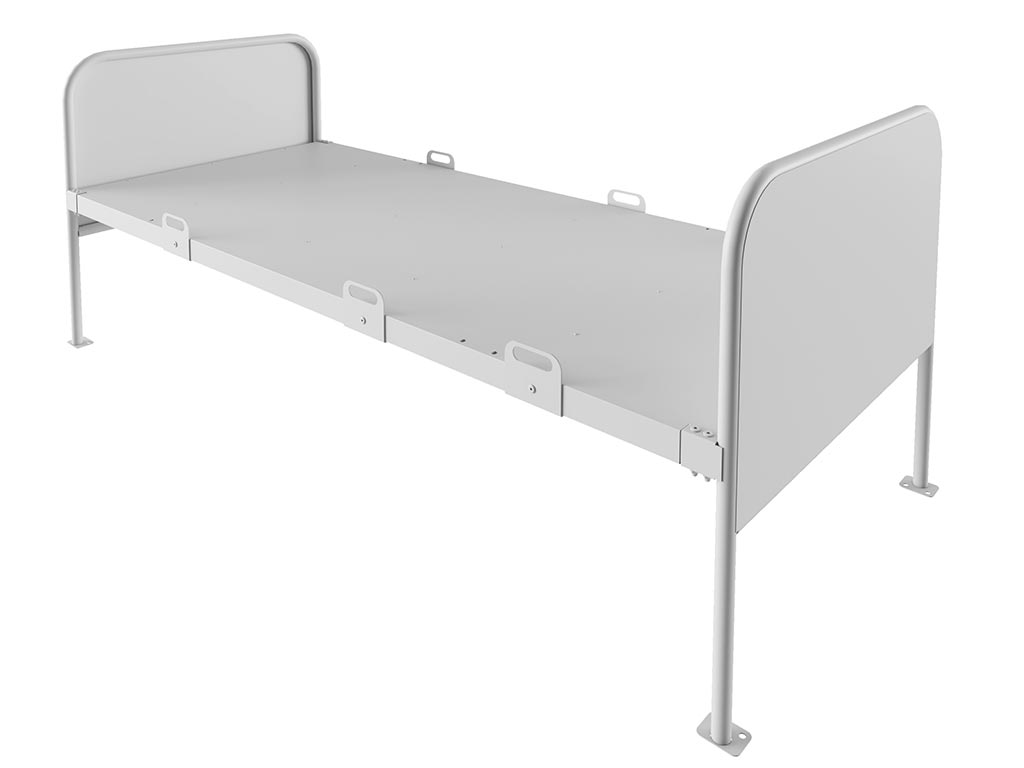 Кровать предназначена для эксплуатации в психоневрологических диспансерах и в спецучреждениях. Кровать состоит из подматрацной рамы и двух спинок и представляет собой разборную конструкцию, элементы которой выполнены сварными из стального профиля с полимерно-порошковым покрытием.