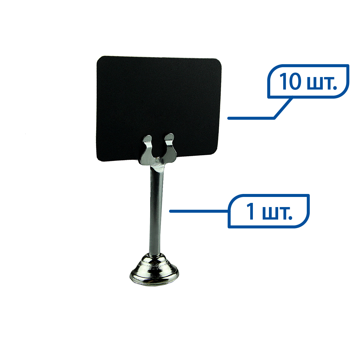 Комплект состоит из металлического держателя ценника на круглом утяжеленном основании и табличек формата А7. Предназначен для установки вставки толщиной до 2 мм. Зажим в двух точках соприкосновения увеличивает надежность фиксации ценника.