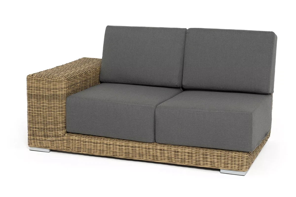 Правый модуль «Капри», выполненный из круглого искусственного ротанга соломенного оттенка, позволяет использовать не только как самостоятельный элемент, но и быть частью лаунж-зоны, в которую данная модель превосходно интегрируется.
