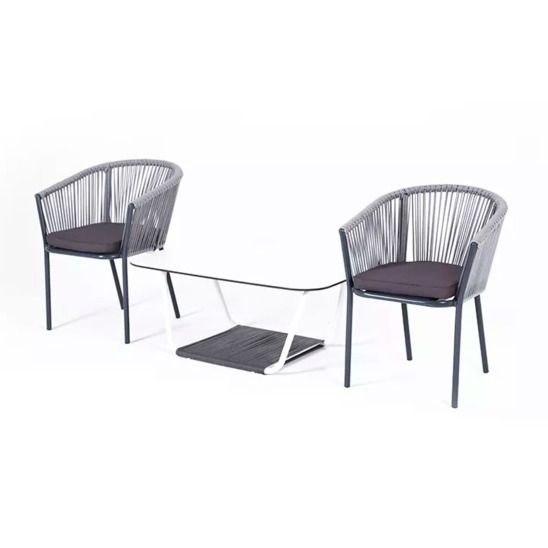 Каркас мебели изготовлен из алюминия темно-серого цвета. Материал столещницы - HPL молочного цвета, это высококачественный монолитный компакт-пластик, толщииной 12 мм. Каркас стульев и нижняя часть столика оплетены вручную эластичными синтетическими лентами из высокопрочных полиэфирных волокон (роуп). Стулья оснащены подушками серого цвета со съемными чехлами. Предусмотрена влагоотталкивающая пропитка материала.