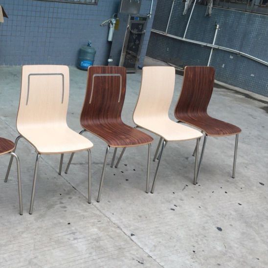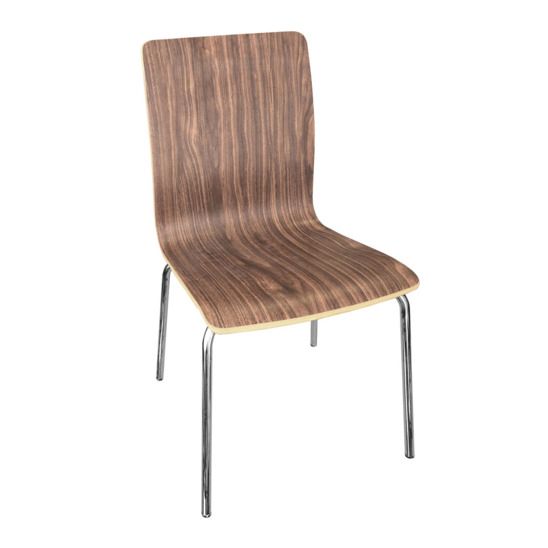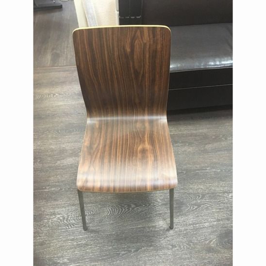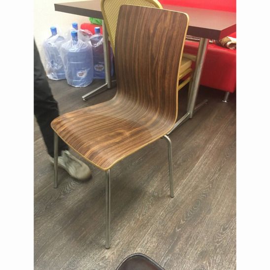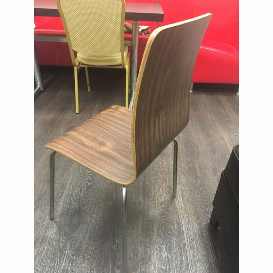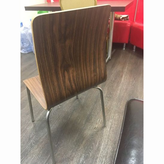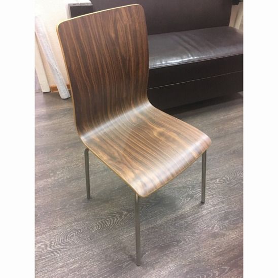 Стул металлический. Каркас - нержавеющая сталь полированная до зеркального вида. Спинка и сиденье - жесткое. Сиденье - ламинированная фанера. Цвет: темный орех, бук.