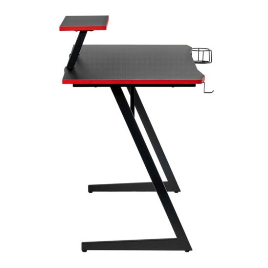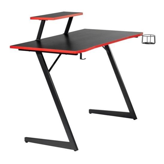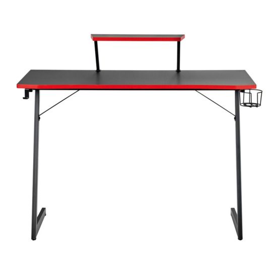 Конструкция простая и прочная: стальная рама выдержит серьезную нагрузку (заявлено до 200 кг). Стол на двух L-образных опорах впишется в любой уголок дома, его легко перемещать, удобно собирать и разбирать. Несмотря на лаконичность дизайна, он очень стильно смотрится: строгая черная столешница «под карбон» отделана красной кромкой.