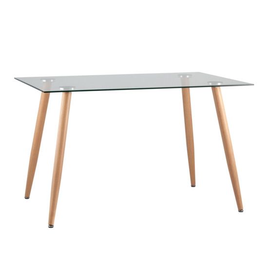 Обеденный стол со стеклянной столешницей. Закаленное стекло выдерживает большие нагрузки, обладает высокой термоустойчивостью и прочностью. Стол украшают крепкие ножки, выполненные из металла, снаружи декорированы принтом под натуральной дерево, что смотрится очень гармонично.
