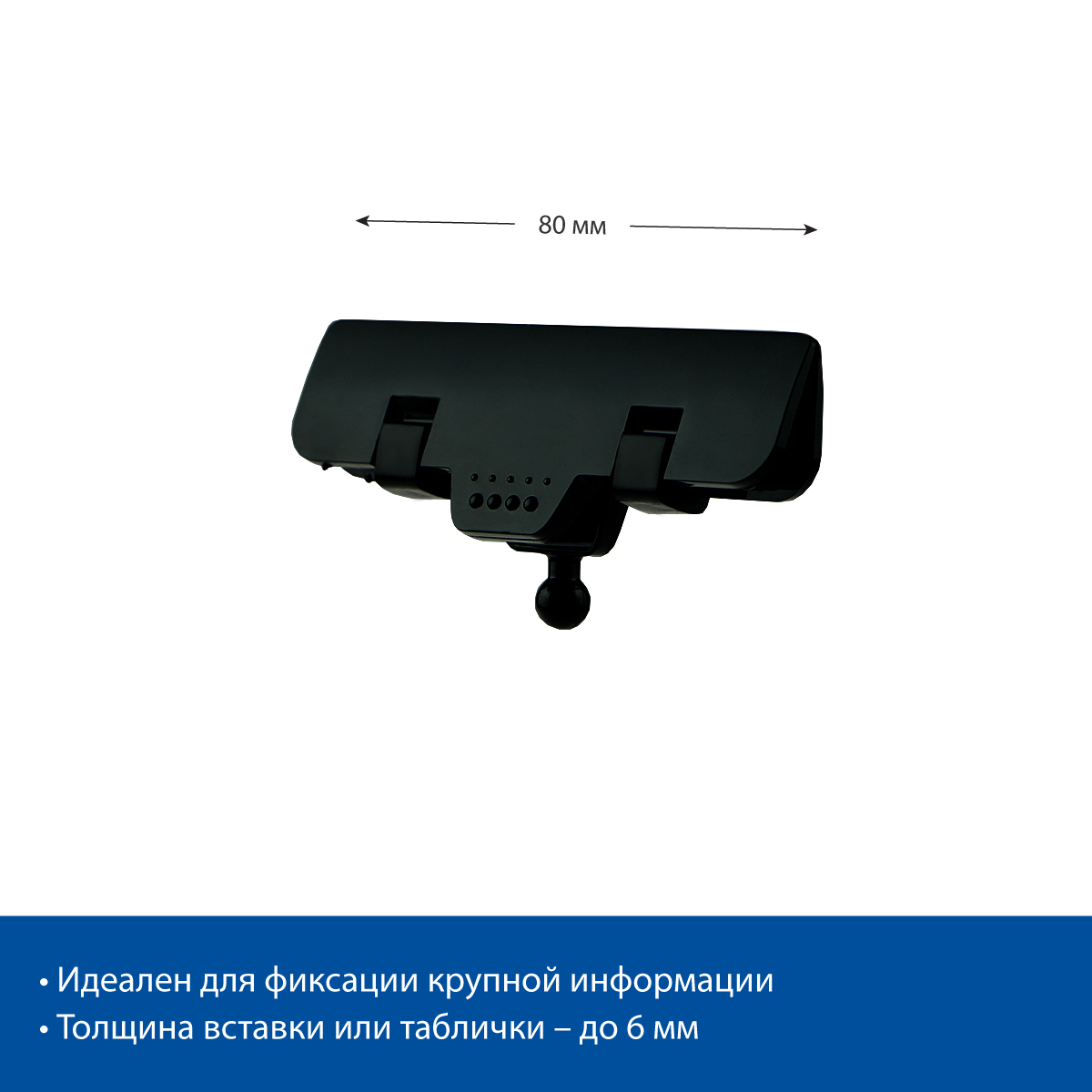 Зажим широкий черного цвета для шарнирного ценникодержателя используется в комплекте с универсальной прищепкой. Зажим подходит для фиксации больших ценников и крупной информации: за счет плотной фиксации обеспечивается сохранность ценника.