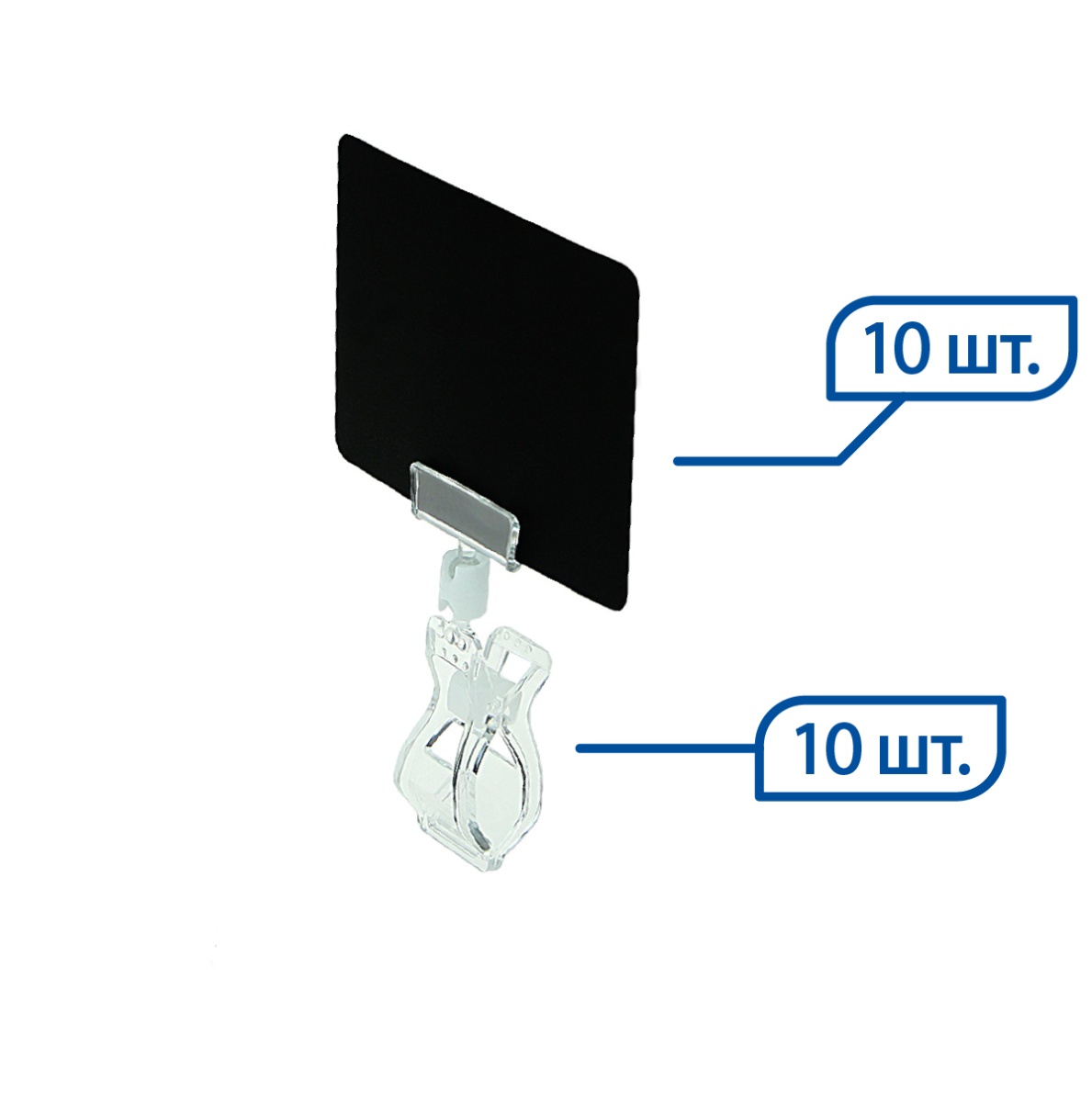 Комплект состоит из ценникодержателя на прищепке FX прозрачного цвета и меловой таблички формата А7. Ценникодержатель крепится на торец полки, корзину толщиной до 25 мм., короб или край посуды. При креплении на трубу - максимальный Ø трубы - 32 мм.