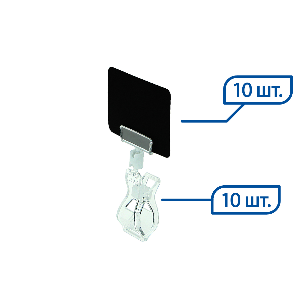 Комплект состоит из ценникодержателя на прищепке FX прозрачного цвета и таблички для нанесения надписей меловым маркером BB формата A8.