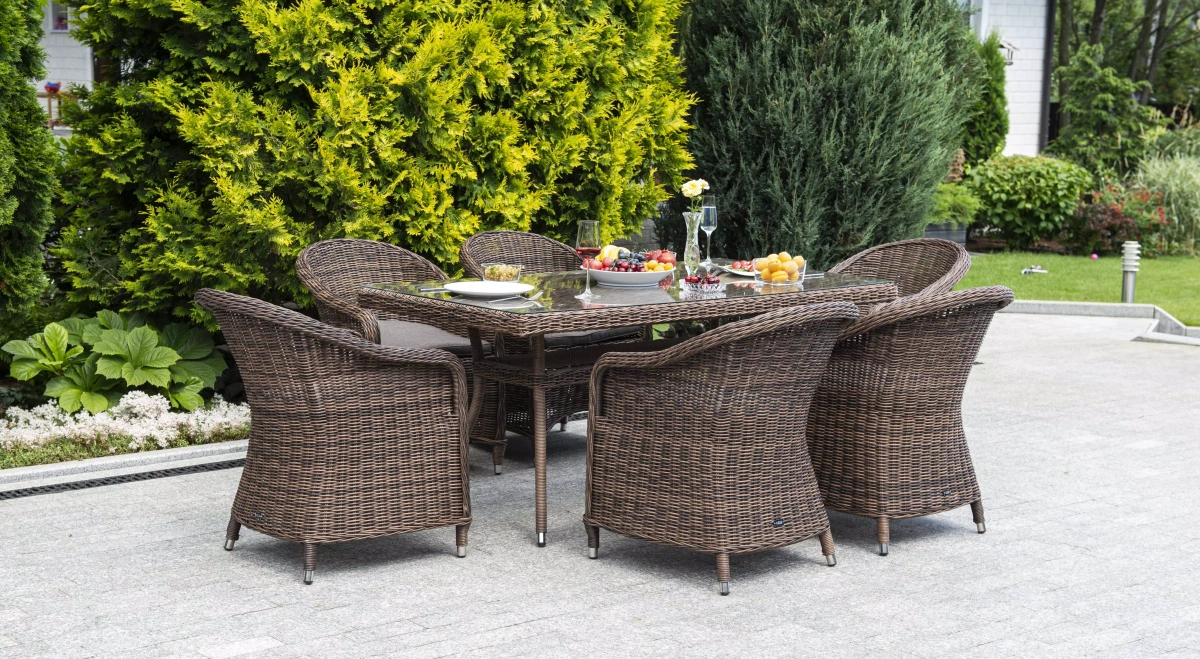 Стеклянная столешница, толщиной 5 мм, идет в комплекте со столом. Подушки на плетеных стулья со съёмными чехлами и водоотталкивающей пропиткой.
