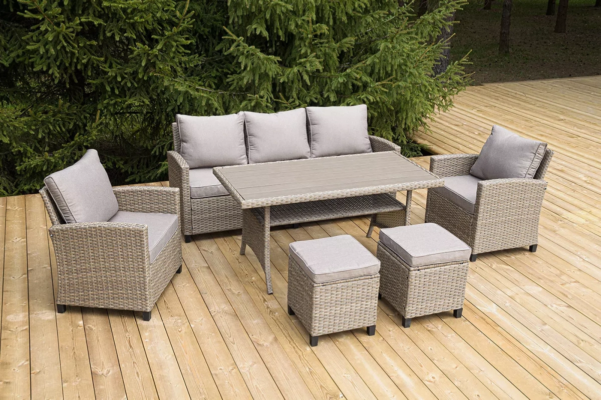 Стол выполнен из стали, вручную оплетенного круглым искусственным ротангом. Столешница изготовлена из полимерного материала ДПК, устойчивого к ультрафиолетовым лучам и декорированным под дерево.