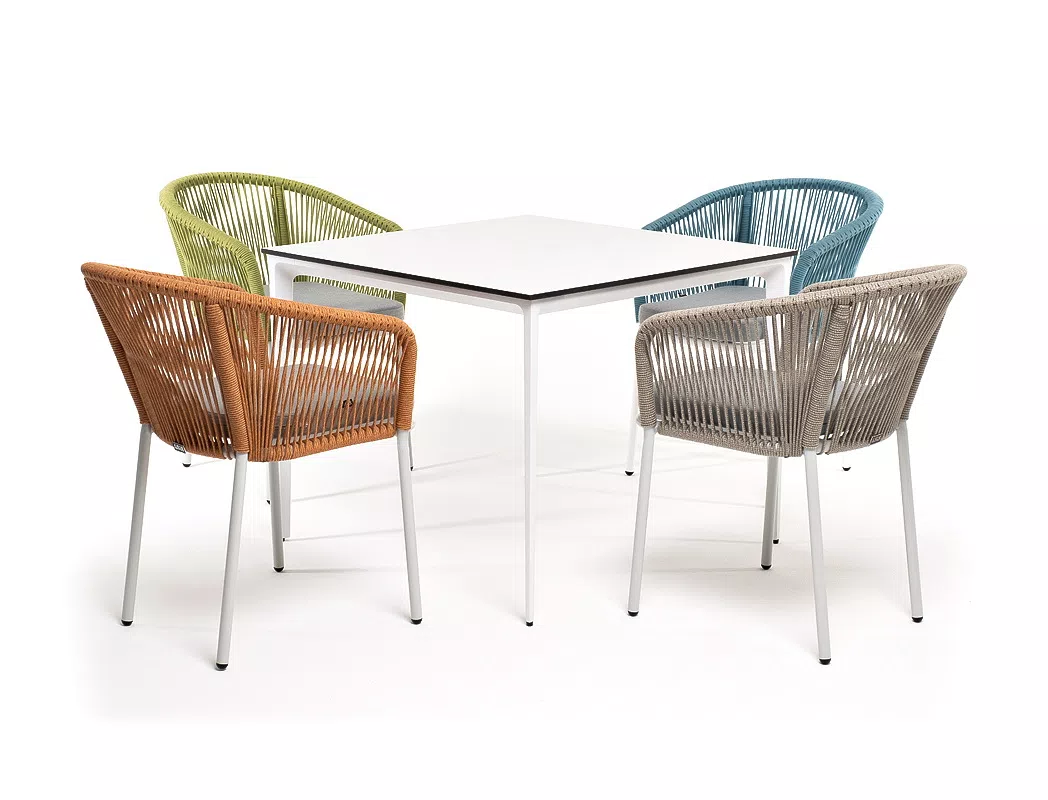 "Аркобалено" обеденная группа на 4 персоны со стульями "Марсель", каркас белый, роуп цветнойцвет салатовый, бирюзовый, оранжевый меланж, серый меланж