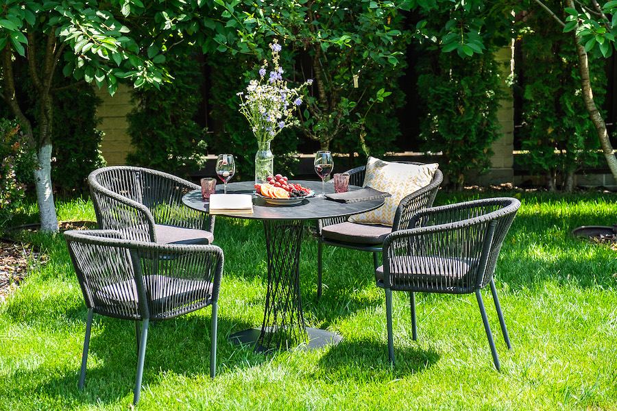 4 кресла из коллекции «Марсель», выполненных из алюминиевого каркаса и ручной оплетки роупом. Это эластичные синтетические ленты из высокопрочных полиэфирных волокон, представлены в темно-сером цвете.
