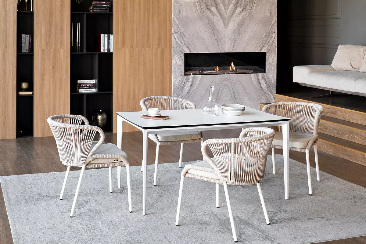 В этот комплект входит стол с прочной и стильной столешницей из HPL-пластика размером 1400×800 мм и высотой 75 см (цвет столешницы - молочный), а также 4 плетеных стула «Милан», изготовленных из бежевого роупа с белым алюминиевым каркасом.