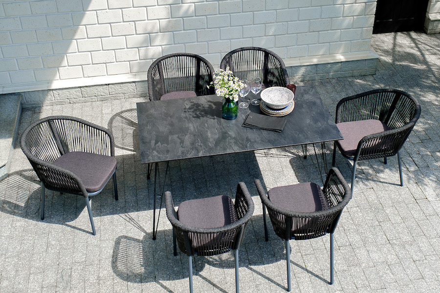 Каркас стульев - алюминиевый, оплетен вручную современным материалом - роупом. Это эластичные синтетические ленты из высокопрочных полиэфирных волокон. В комплект входят подушки со съёмными водоотталкивающими чехлами серого цвета.