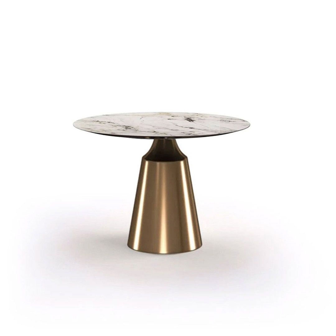 Основание состоит из центрального конусного ствола, выполненного из нержавеющей стали, массивный внешний вид которого облегчается металлическим покрытием нитрид титана цвет золото и соединением с узкой и отступающей столешницей, как бы напоминающей длинную элегантную шею, поддерживающую столешницу. Коллекция включает круглый, овальный, прямоугольный керамический стол «Лукас» с матовым или глянцевым покрытием и версию со столешницей из шпона.