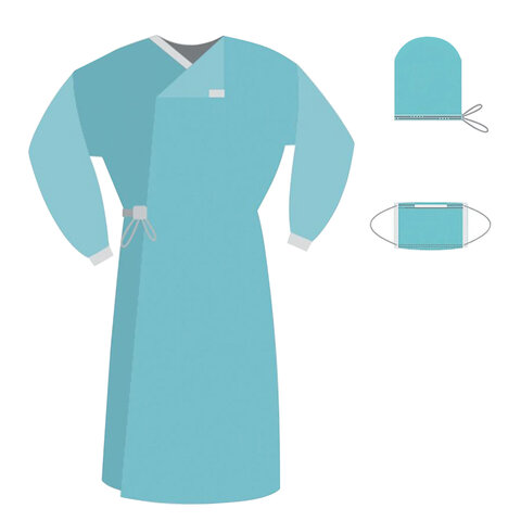 Комплект хирургической одежды КХ-04 из 3 предметов.Набор одноразовой стерильной одежды хирурга для малоинвазивных и кратковременных операций и процедур. Состав: 1. Халат хирургический 140 см, рукава с манжетой, размер 52-54, спанбонд пл. 42 г/м², голубого цвета – 1 шт. 2. Шапочка «Колпак», спанбонд пл. 42 г/м², голубого цвета – 1 шт. 3. Маска медицинская на резинке, трехслойная, голубого цвета – 1 шт. ТУ 9398-020-18603495-2009 РУ № ФСР 2009/06234