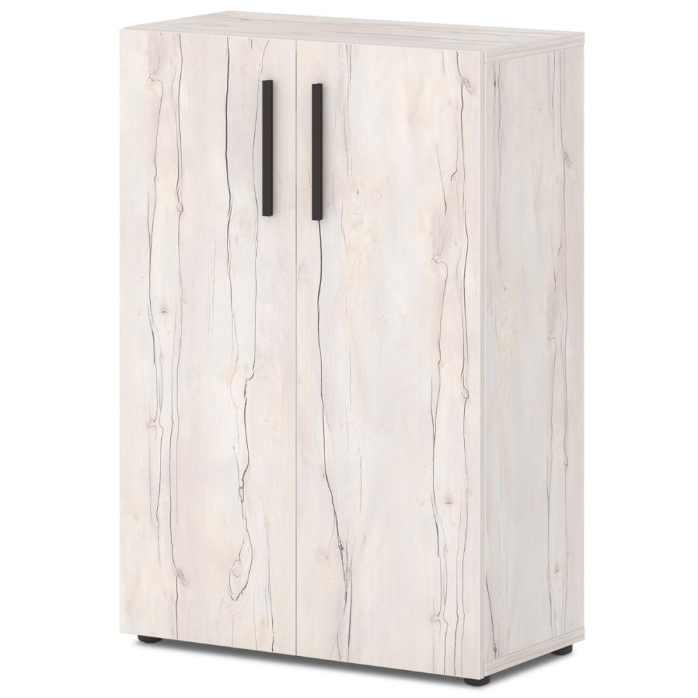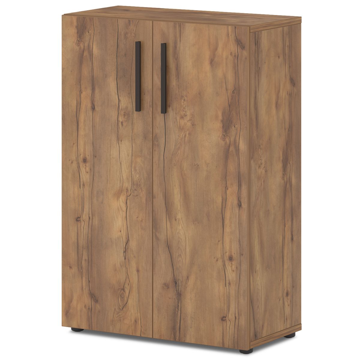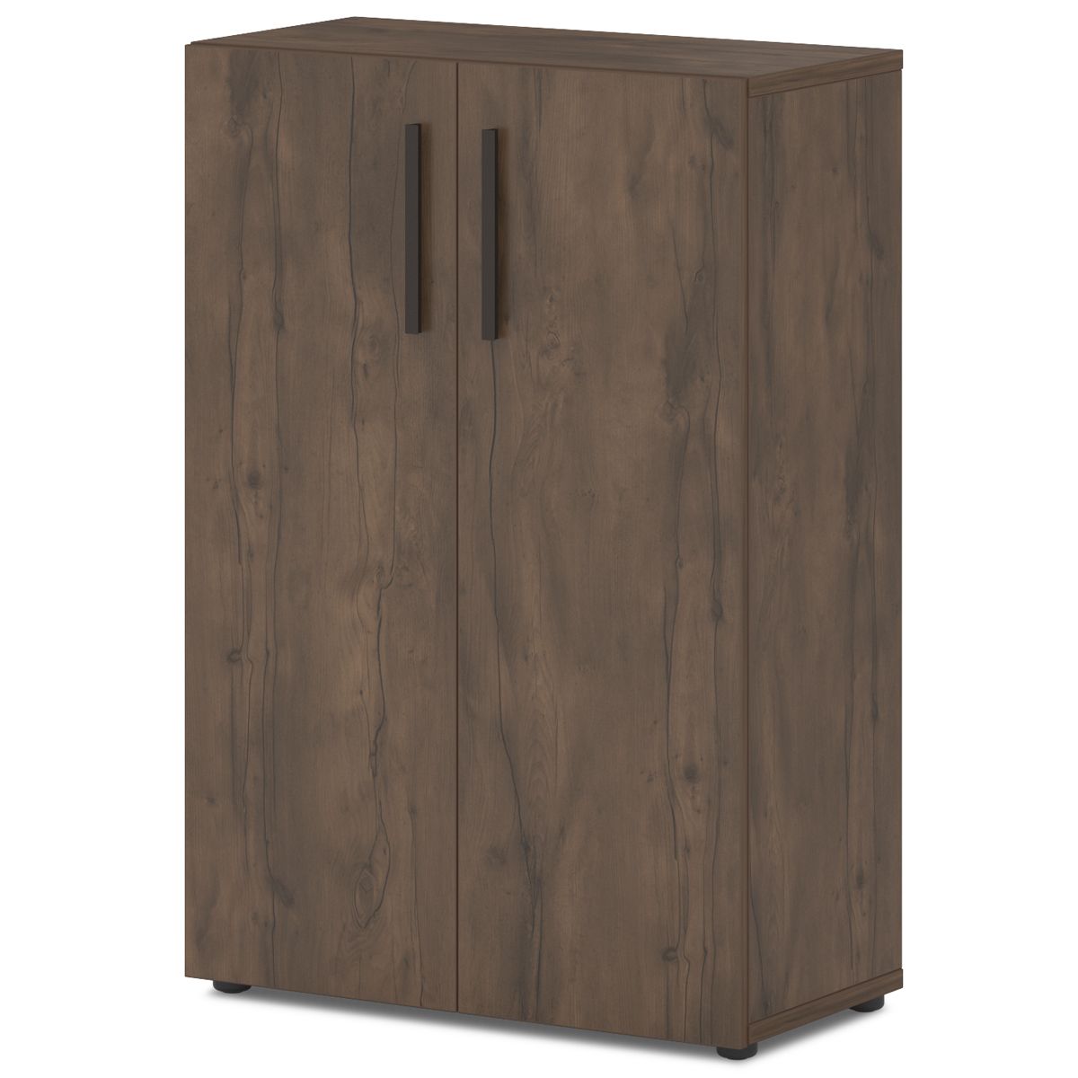 Офисный шкаф для документов средний. Верх, низ, горизонтали изготовлены из ЛДСП 25 мм и оклеены противоударной кромкой ABS 0,4 мм. Бока изготовлены из ЛДСП 18 мм и оклеены противоударной кромкой ABS 0,4 мм. Задняя стенка изготовлена из ЛДСП 10 мм. Двери изготовлены из ЛДСП 18 мм и оклеены противоударной кромкой ABS 2 мм. Ручка-рейлинг коричневая RAL8019 длиной 260 мм с межосевым расстоянием 128 мм. Опоры шкафа снабжены компенсатором неровности пола. Петли оснащены механизмом плавного закрывания. Все соединительные элементы оснащены фурнитурой для многократной сборки и разборки изделия. Используется фурнитура ведущих европейских производителей.