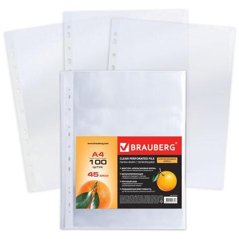 Папки-файлы перфорированные А4 BRAUBERG, КОМПЛЕКТ 100 шт., матовые, 45 мкм, 221713