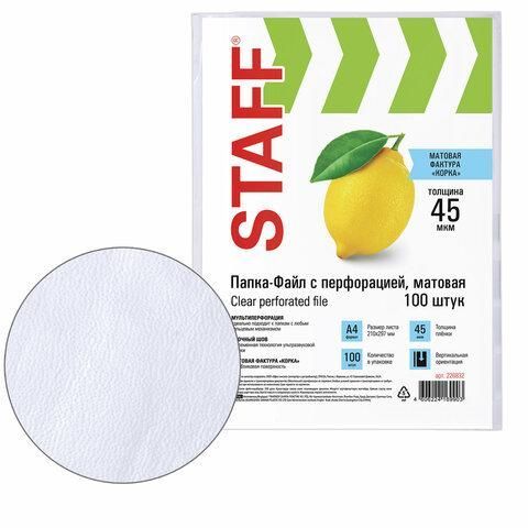 Перфорированные папки-файлы STAFF — оптимальное решение для различных государственных учреждений, офисов коммерческих предприятий. Предназначены для хранения и защиты печатных документов.Перфопапки формата А4 с вертикальным размещением содержат универсальную перфорацию, а также имеют матовую поверхность и прочные швы. Толщина пленки - 45 мкм, что подходит для хранения документов - до 50 листов в 1 папке-файле.