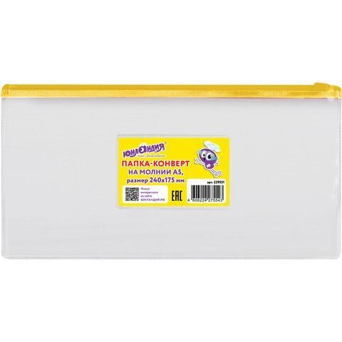 Папка-конверт на молнии ЮНЛАНДИЯ идеально подойдет для хранения и транспортировки важных школьных документов.Изготовлена из прочного прозрачного пластика толщиной 0,12 мм с гладкой фактурой. Формат А5 (240х175 мм). Герметичная застежка-зиплок защищает документы от механических повреждений, а также пыли и влаги. Имеется карман для визитки. Цвет молнии - ассорти (поставляется без возможности выбора).