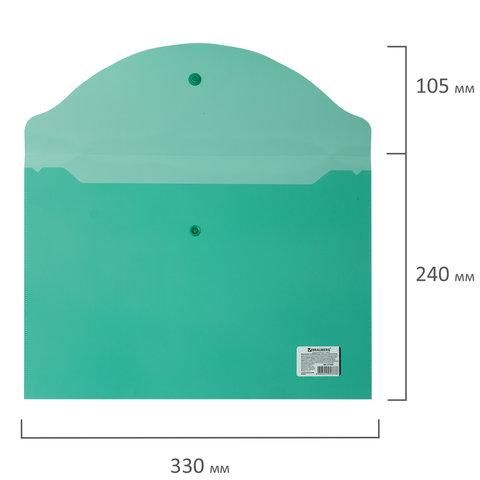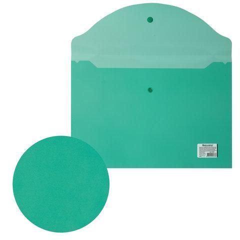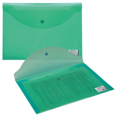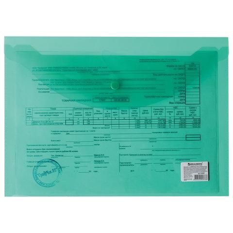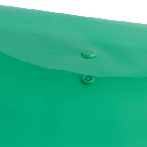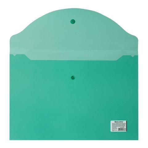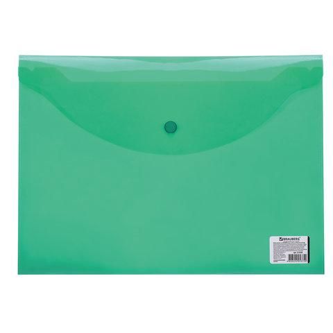 Папка-конверт с кнопкой BRAUBERG, А4, до 100 листов, прозрачная, зеленая, 0,15 мм, 221635