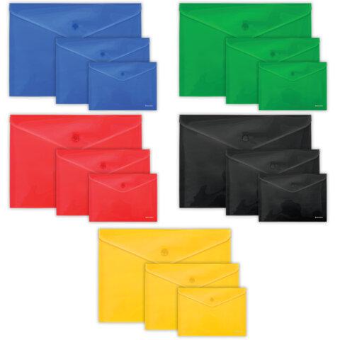 Папка-конверт с кнопкой КОМПЛЕКТ 15 шт., А4, А5, А6 по 5 шт., цвета ассорти, BRAUBERG, 0,18 мм, 272867