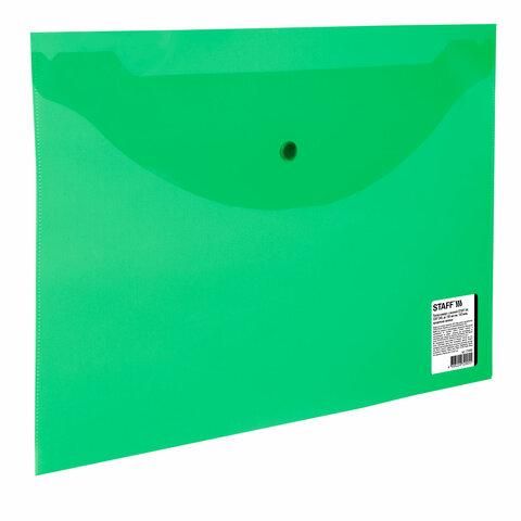 Папка-конверт с кнопкой STAFF, А4, до 100 листов, прозрачная, зеленая 0,15 мм, 270468