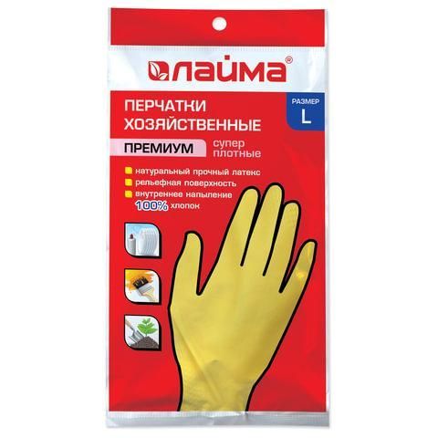 Перчатки хозяйственные латексные ЛАЙМА "Премиум", МНОГОРАЗОВЫЕ, хлопчатобумажное напыление, суперплотные, L (большой), 600272
