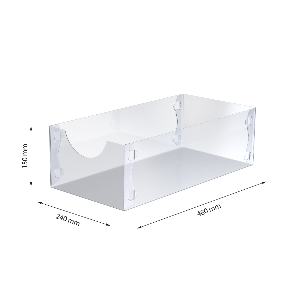 Диспенсер продается в плоском разобранном виде, легко собирается без дополнительных инструментов и подходит для полок глубиной 500 мм. Габариты в собранном состоянии (ШхГхВ): 240х480х150 мм.