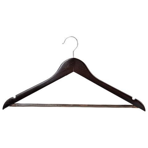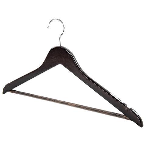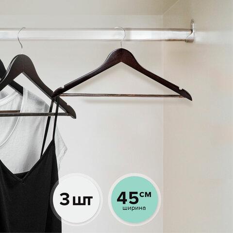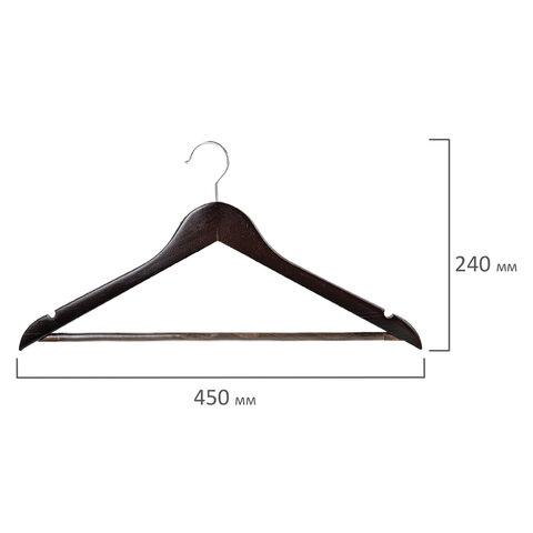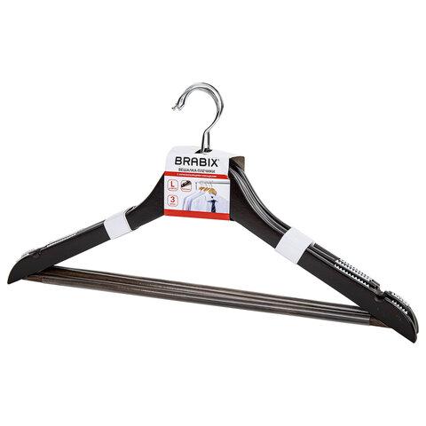 Вешалки-плечики BRABIX с перекладиной для одежды и антискользящими плечиками с рифленой силиконовой поверхностью, которая исключает сползание одежды. Выполнены из качественной древесины благородного темного окраса. Стильные и очень удобные.Вешалки изготовлены из натурального дерева. Лакированные, с невыкручивающимся крючком. Предназначены для бережного хранения одежды. Долговечные и прочные, не прогибаются под тяжелой верхней одеждой. Эстетичны, отлично вписываются в общий интерьер гардеробной. Размер модели составляет 45 см. 3 штуки в комплекте.