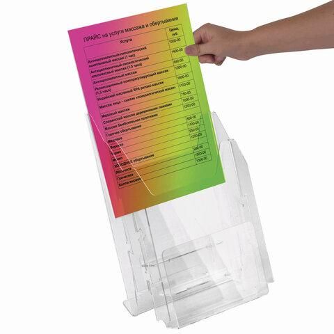Вертикальная настольная подставка STAFF для рекламных и информационных материалов формата А4.Изготовлена из прозрачного акрилового стекла. Предназначена для настольного размещения. Позволяет размещать рекламные материалы каскадом со смещением. Упакована в полиэтилен.