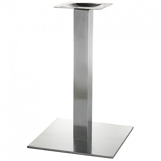 Подстолье из полированной нержавеющей стали (матовое). Основание плоское. Размер верхней площадки: 25*25 см, сечение трубы 8х8 см. Рекомендуемый размер столешницы: D-70, 70х70
