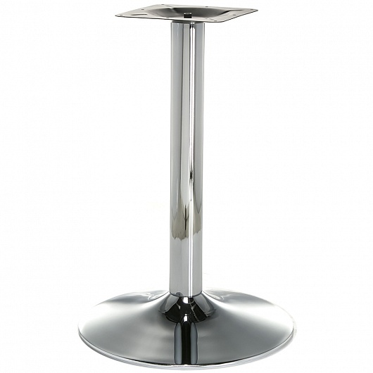 Подстолье хромированное. Основание "рюмочкой". Диаметр основания: 50 см, диаметр трубы: 7,6 см, размер верхней площадки: 25х25 см. Рекомендуемый размер столешницы: D-70, 70х70.